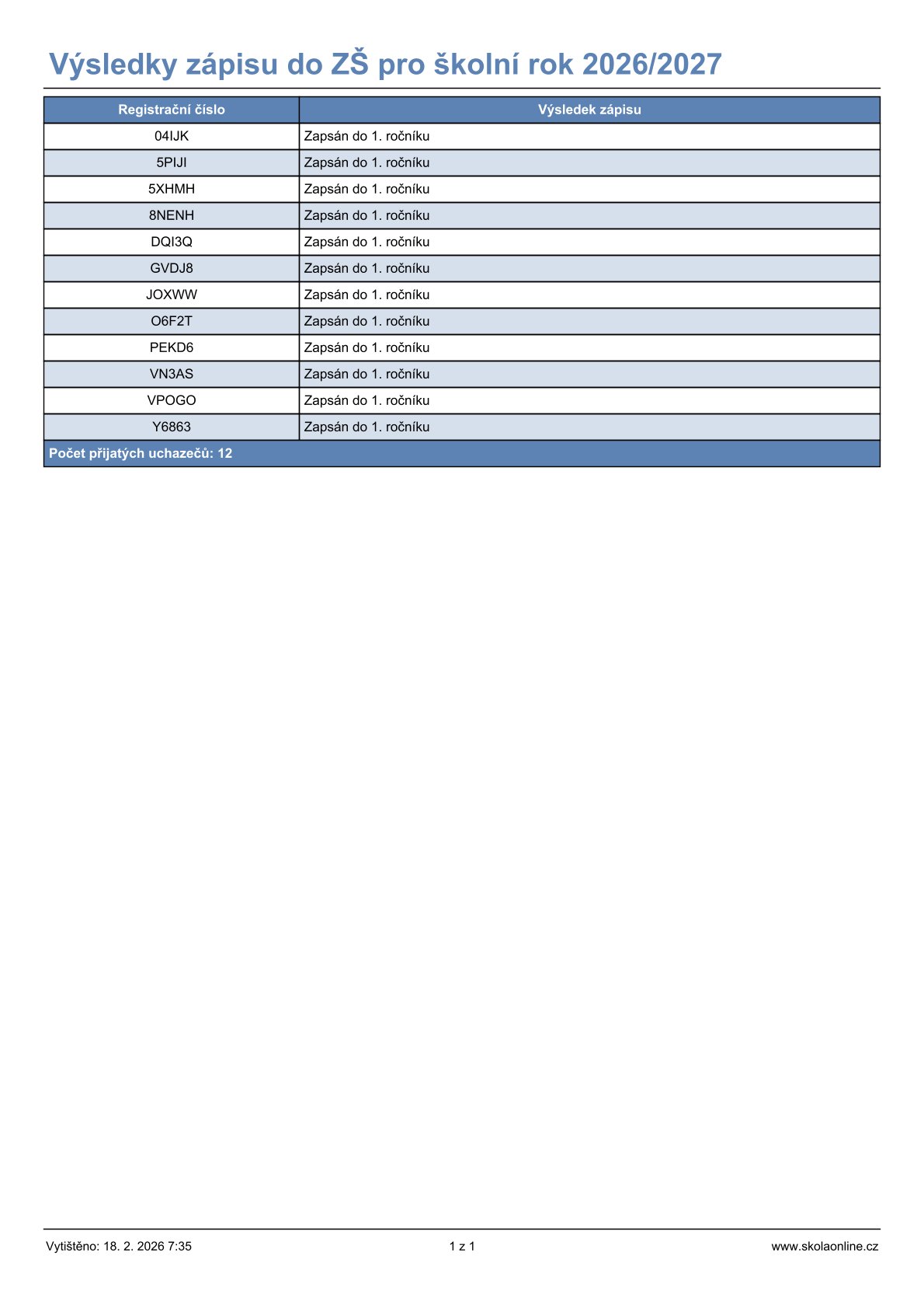 zde máte anonymizovaný seznam přijatých dětí do 1. třídy pro školní rok 2026/2027.